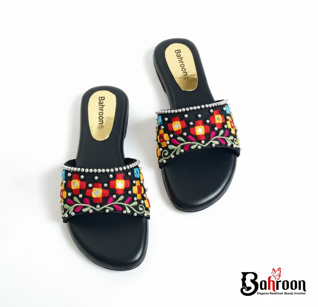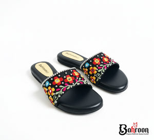 Crafted by our skilled artisans, each piece promises a distinctive and flawless finish. These striking black slide sandals showcase exquisite detailing with intricate and vibrant green and gold threadwork across the wide front strap. The design is beautifully complemented by delicate beadwork or studs for a truly artistic appeal. Featuring a comfortable mid-height block heel and top-quality materials, they effortlessly exude luxury.