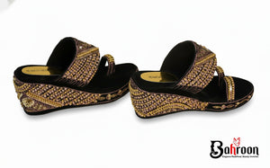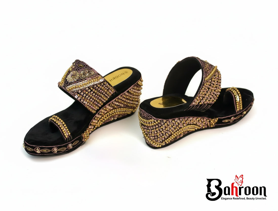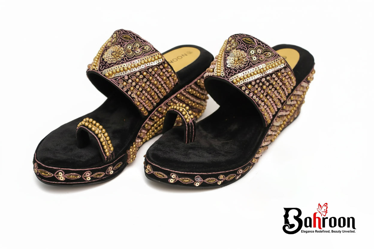 Handcraft materials : pearl, crystal, chumki  puti, pipe puti, jori, suta craft work on Velvet, these wedges offer a luxurious finish that complements any outfit. Featuring a blend of rubber and leather board, the inner lining ensures a soft, comfortable fit that keeps your feet cozy throughout the day. The wedges are equipped with a high-grade rubber sole, providing excellent grip and durability for all-day wear.