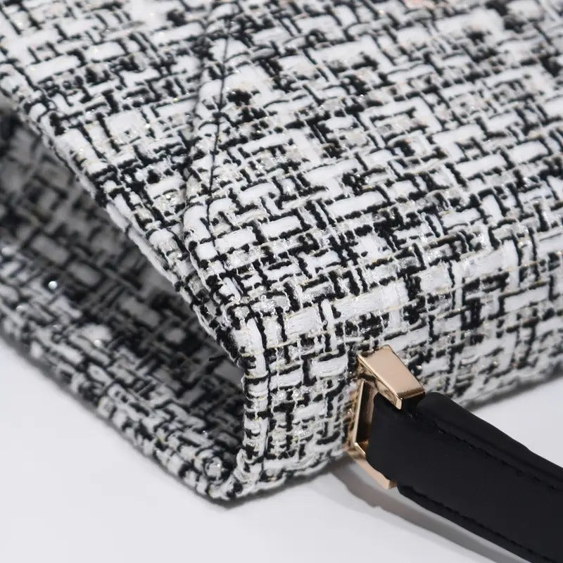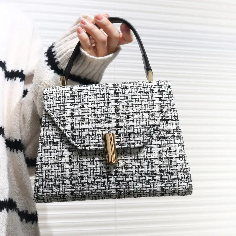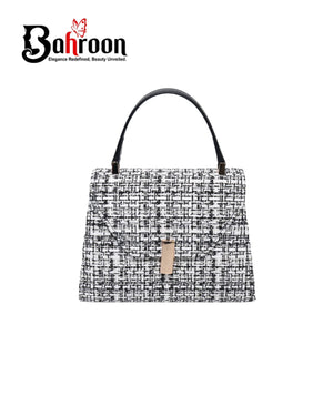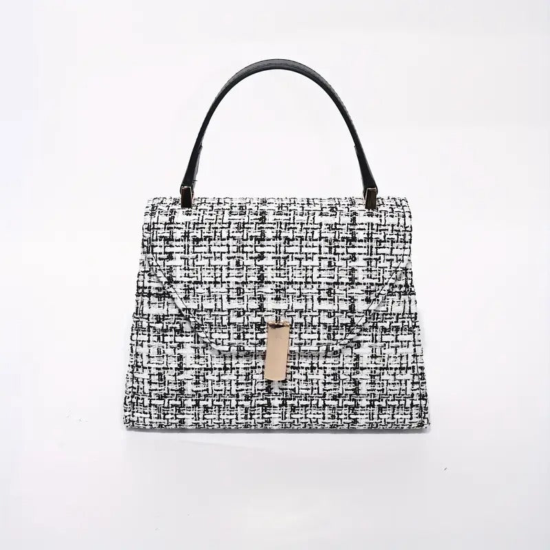 This bag features a chic design with a classic black and white pattern, perfect for adding a touch of sophistication to any outfit. It has a structured silhouette, a top handle for easy carrying, and a sleek gold-tone clasp that enhances its elegance. Ideal for both casual and formal occasions, this versatile piece can hold your essentials while making a stylish statement.