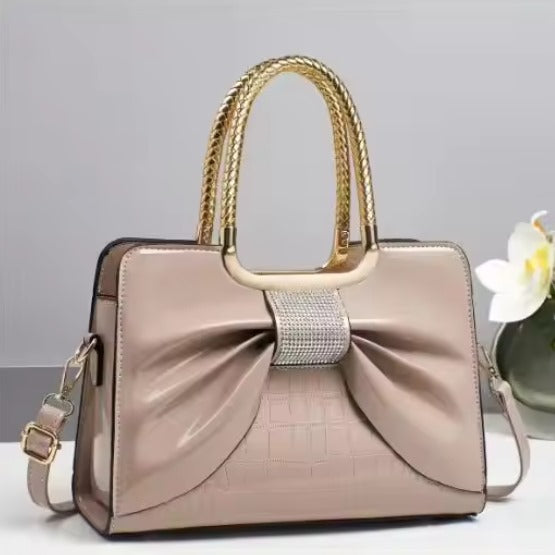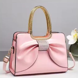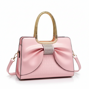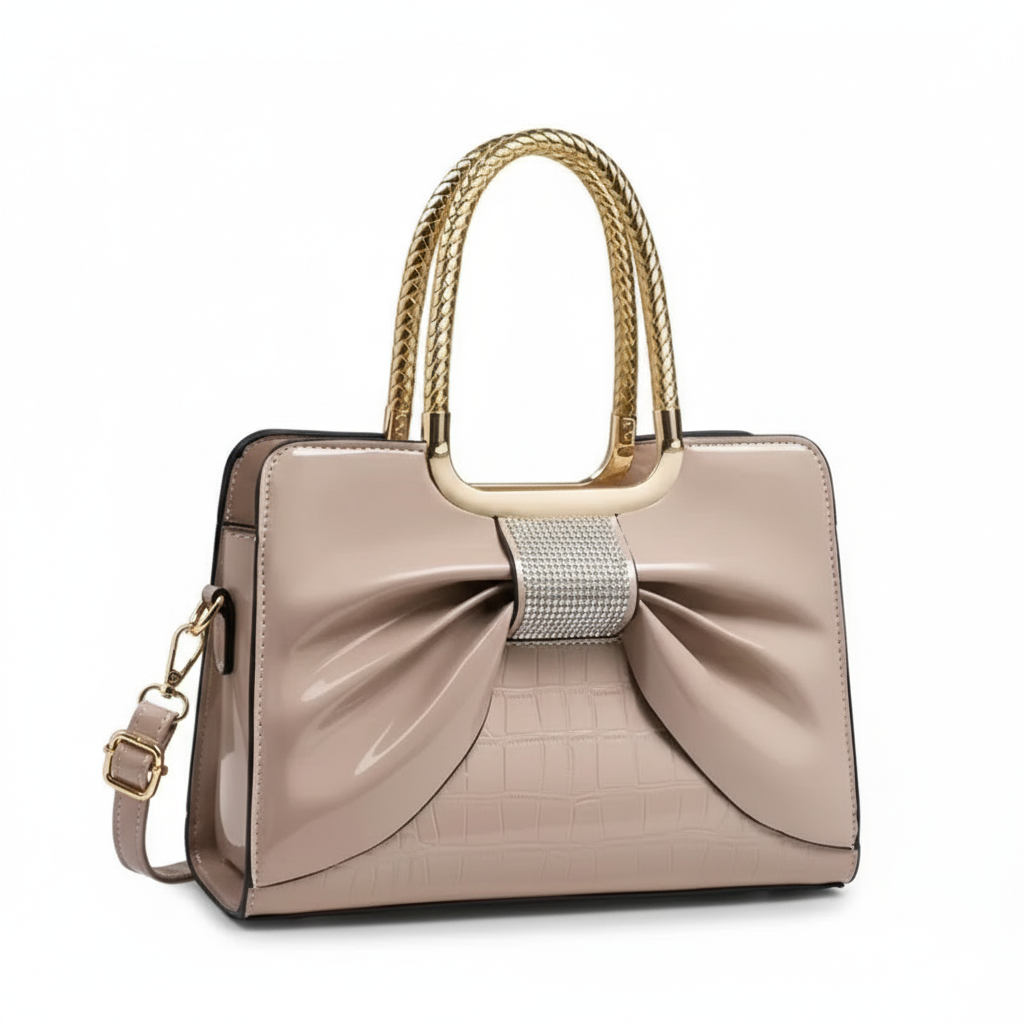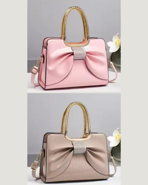 This stylish handbag is available in soft pink and Khaki, featuring a prominent bow detail on the front that adds a playful touch. It has braided golden handles for a chic contrast and a detachable strap for versatility. The bag is accented with a sparkling rhinestone band, enhancing its elegance, while the spacious interior allows for easy organization of essentials. Perfect for various occasions, this handbag combines playful design with practicality, making it a fashionable accessory for any outfit.