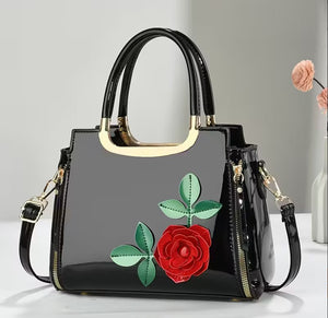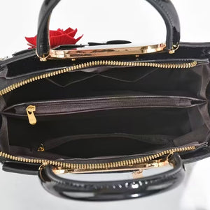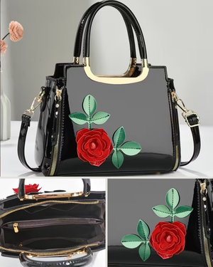 This elegant black patent handbag features artistic faux flowers in red and green, adding a vibrant touch. It has sturdy top handles and a detachable strap for versatility, accented with gold-tone hardware and a secure zip closure. The spacious interior includes multiple compartments for organization, making it suitable for both casual and formal occasions. Overall, this bag combines style and functionality, making it a chic accessory for any outfit.