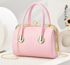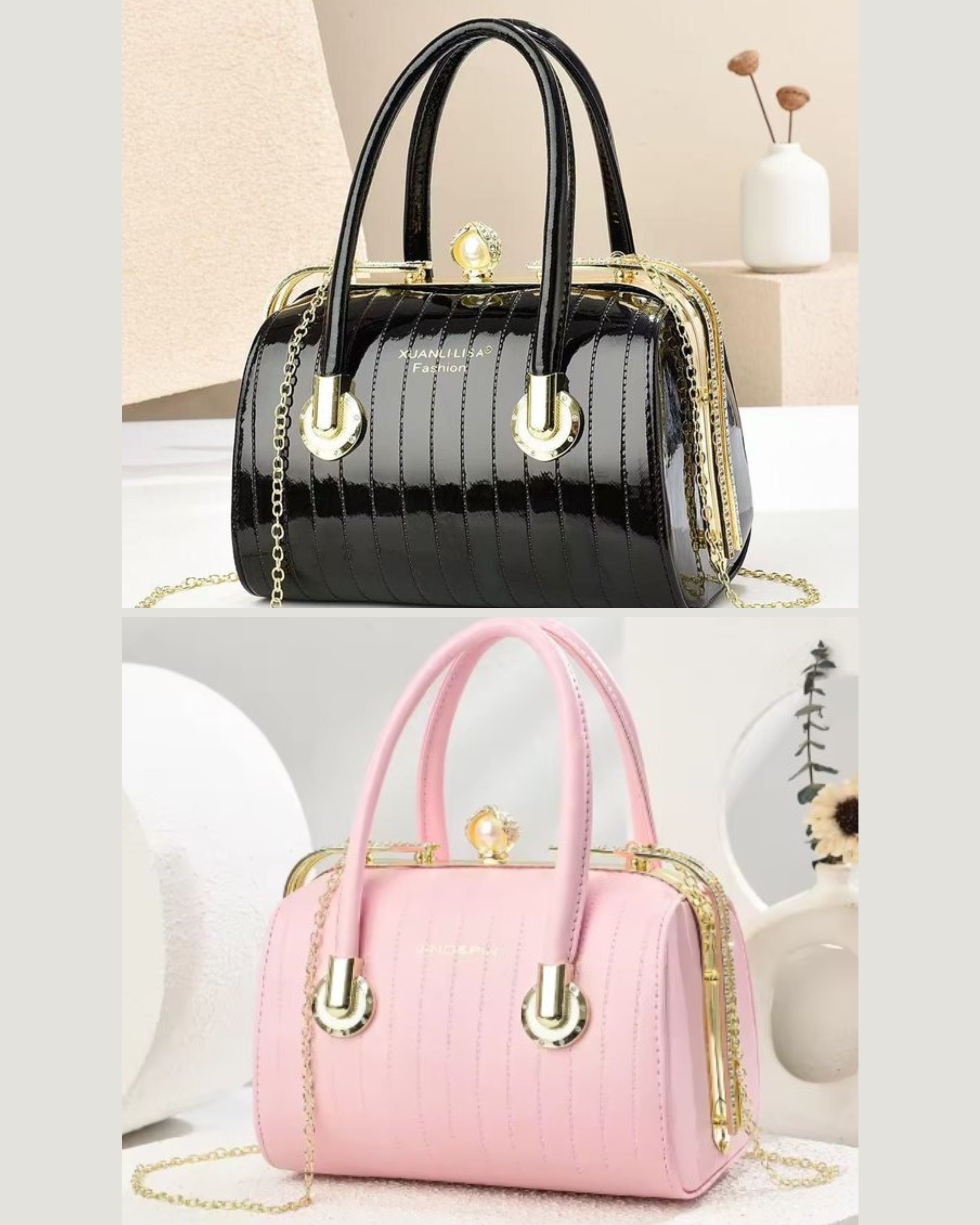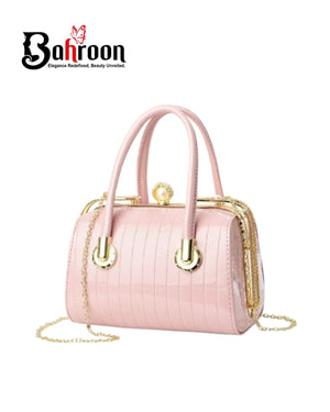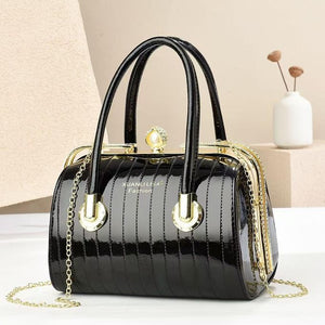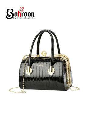 The chic black handbag features a glossy patent finish and a structured silhouette with vertical stripes, adding elegance to its design. It includes two sturdy top handles and a detachable chain strap for versatility, with a decorative gold-tone clasp for secure closure. Compact yet spacious, it’s perfect for carrying essentials and suits both casual and formal occasions, making it a stylish and practical accessory.