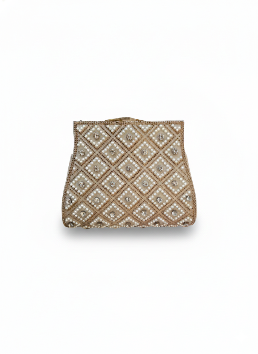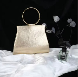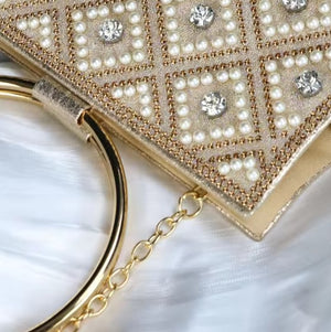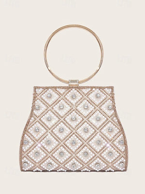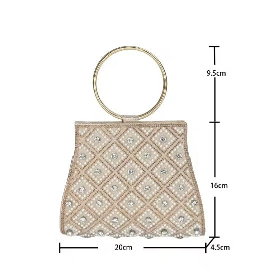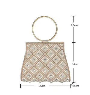 This stunning bag features a sophisticated design embellished with intricate diamond patterns and sparkling rhinestones, creating a luxurious look. The unique circular handle adds a modern twist, making it easy to carry. Its elegant gold hue complements a variety of outfits, making it perfect for formal events or evening outings. This eye-catching accessory combines style and functionality, ensuring you stand out wherever you go.