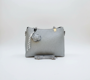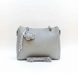 This is a stylish, medium-sized handbag in a soft, muted grey color. Its most distinctive feature is the woven or braided texture that covers the entire exterior, giving it a rich, dimensional appearance. The bag has a somewhat relaxed, yet structured shape, with a wider top that gently tapers towards the bottom.ย It features two short, integrated top handles, which are partially visible, suggesting it can be carried by hand or in the crook of the arm.