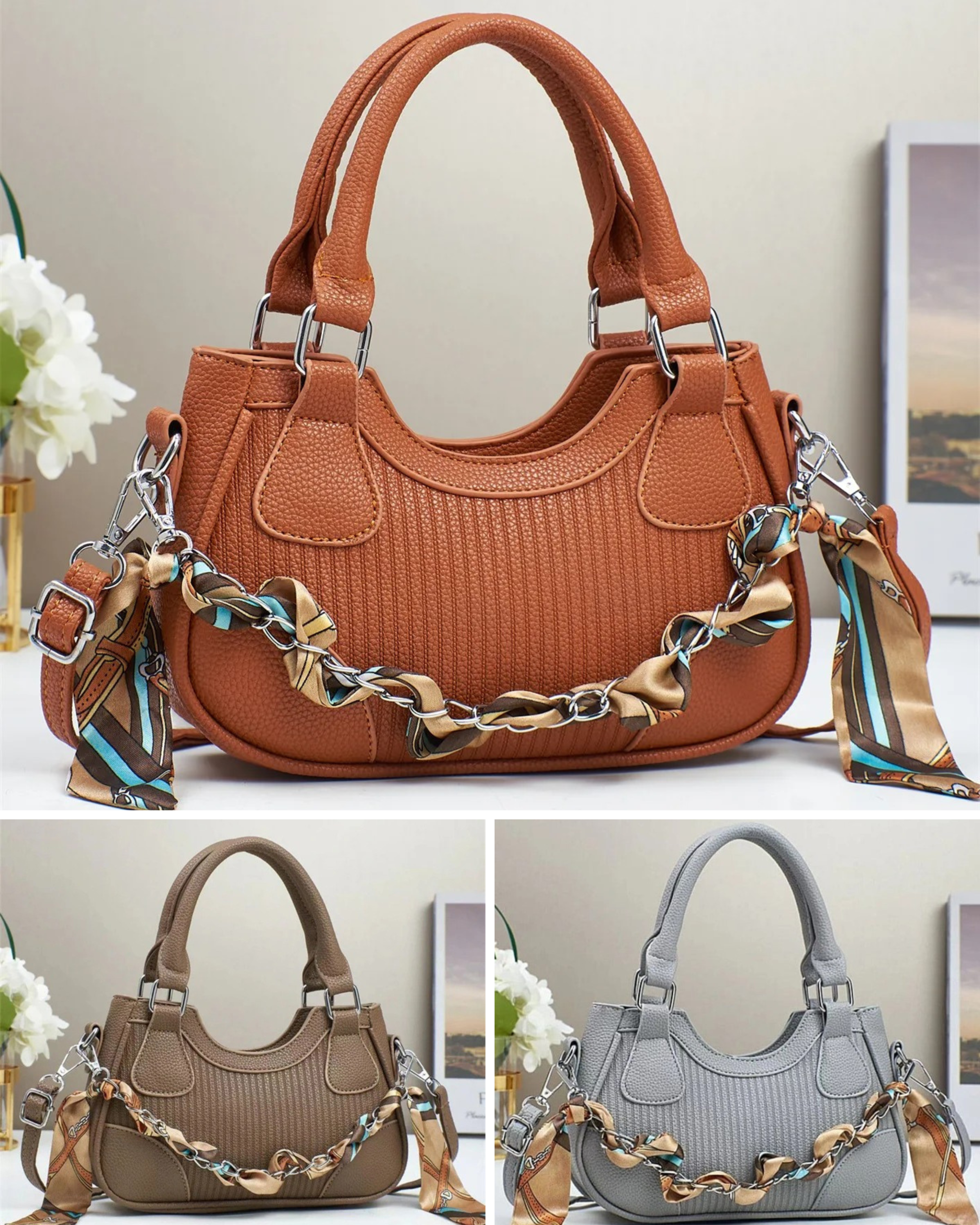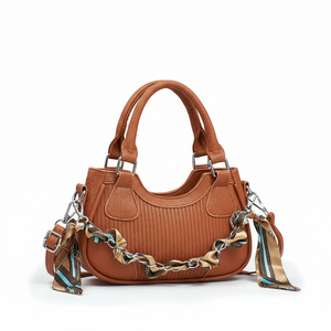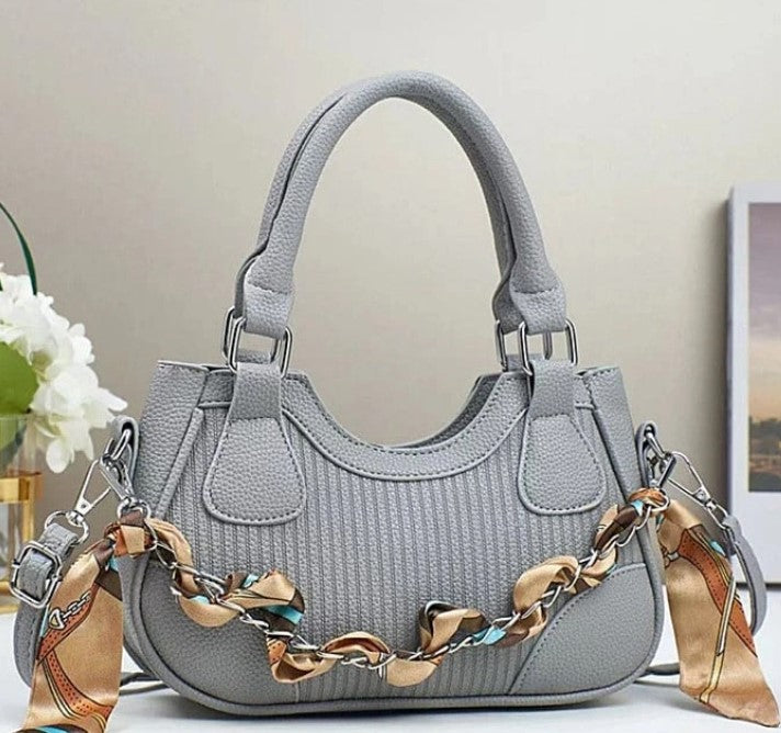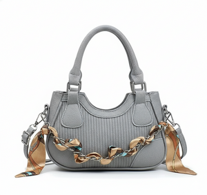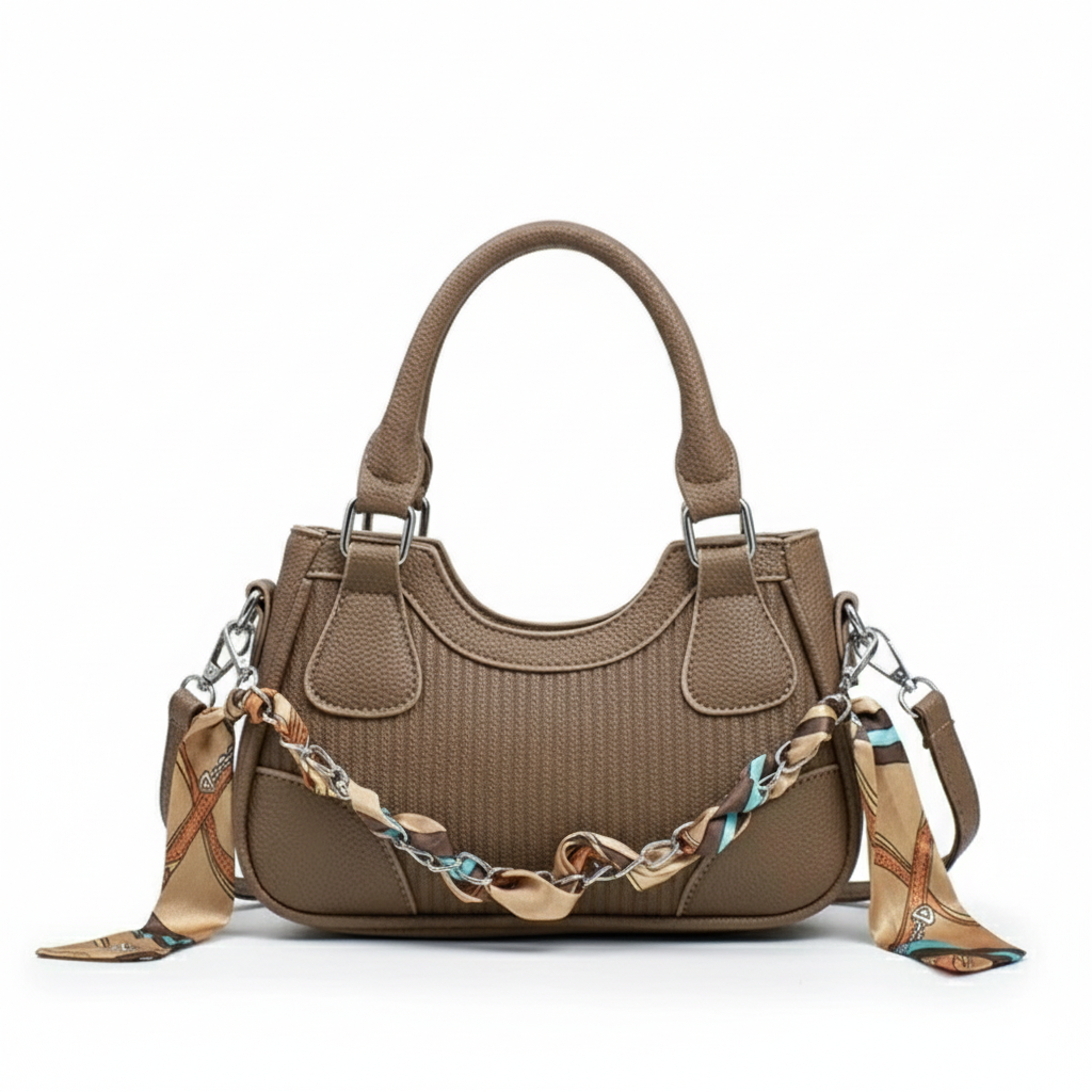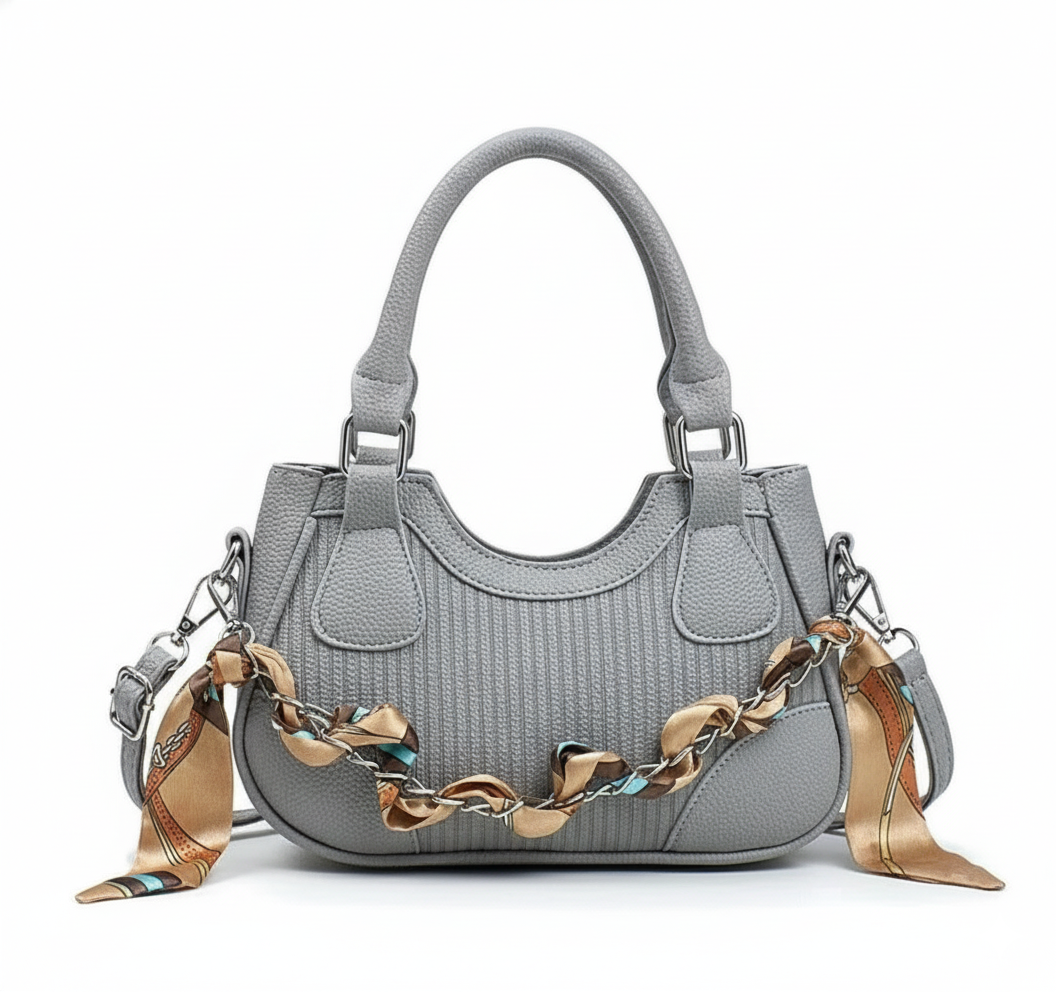 This stylish tote bag is available in brown, grey and khaki featuring a textured ribbed design that adds a modern touch. It has sturdy top handles for easy carrying and a detachable chain strap adorned with a decorative scarf for added flair. With silver-tone hardware, it combines durability with elegance. Compact yet spacious enough for essentials, this bag is perfect for both daily use and special occasions, making it a versatile accessory for any outfit.