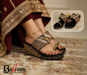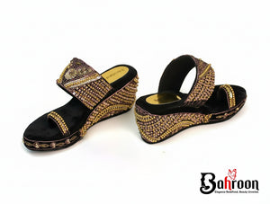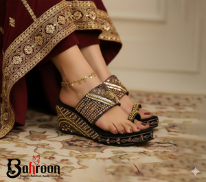 Handcraft materials : pearl, crystal, chumki puti, pipe puti, jori, suta craft work on Velvet, these wedges offer a luxurious finish that complements any outfit. Featuring a blend of rubber and leather board, the inner lining ensures a soft, comfortable fit that keeps your feet cozy throughout the day. The wedges are equipped with a high-grade rubber sole, providing excellent grip and durability for all-day wear.