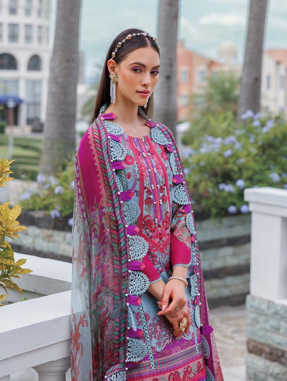 The dress offers a combination of comfort and style, featuring a loose, breathable fit crafted from lightweight fabric, perfect for warm weather. This design allows for easy movement, ensuring all-day comfort. The color palette is a stunning blend of soft blue and vibrant pink accents, creating a striking contrast. The intricate embroidery adds depth and elegance, making it not only a comfortable choice but also a visually appealing outfit suitable for various occasions. Overall, it beautifully merges comfort with a lively and sophisticated aesthetic.