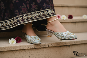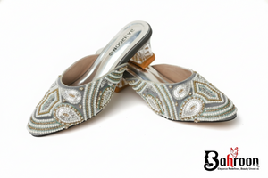 Meticulously crafted by our in-house designers, each pair guarantees a distinctive and impeccable finish. These elegant white and silver slip-on mules feature an exquisite and captivating detailing with intricate beadwork, subtle metallic threadwork, and traditional artistry over the toe, With a clear, sculptural block heel and finest-grade materials, they add a touch of ethereal opulence to your everyday or festive look. Made from genuine leather, they offer superior longevity and ultimate all-day comfort.