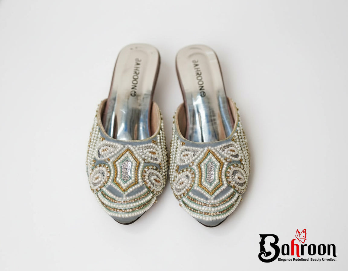 Handcrafted Material : Pearl, stone, jarkan, chumki, dapka, jori, puti. Material: The shoes are crafted from high-quality PU, providing a luxurious look and feel while ensuring durability. Inner Material: The interior features a combination of rubber and leather board, ron sheet and latex offering exceptional comfort and support for all-day wear. Sole: Designed with a high-grade rubber sole.