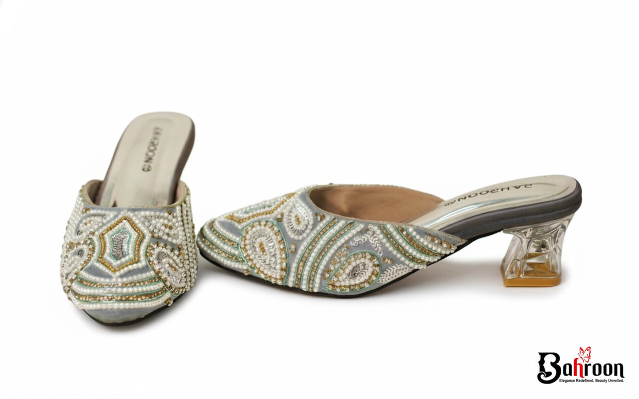Handcrafted Material : Pearl, stone, jarkan, chumki, dapka, jori, puti. Material: The shoes are crafted from high-quality PU, providing a luxurious look and feel while ensuring durability. Inner Material: The interior features a combination of rubber and leather board, ron sheet and latex offering exceptional comfort and support for all-day wear. Sole: Designed with a high-grade rubber sole.