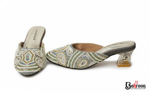 Meticulously crafted by our in-house designers, each pair guarantees a distinctive and impeccable finish. These elegant white and silver slip-on mules feature an exquisite and captivating detailing with intricate beadwork, subtle metallic threadwork, and traditional artistry over the toe, With a clear, sculptural block heel and finest-grade materials, they add a touch of ethereal opulence to your everyday or festive look. Made from genuine leather, they offer superior longevity and ultimate all-day comfort.