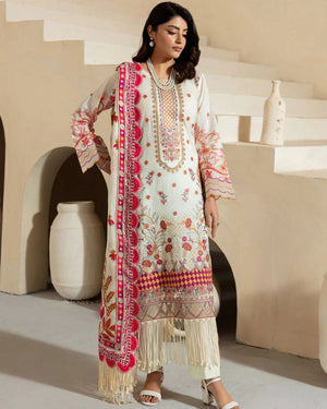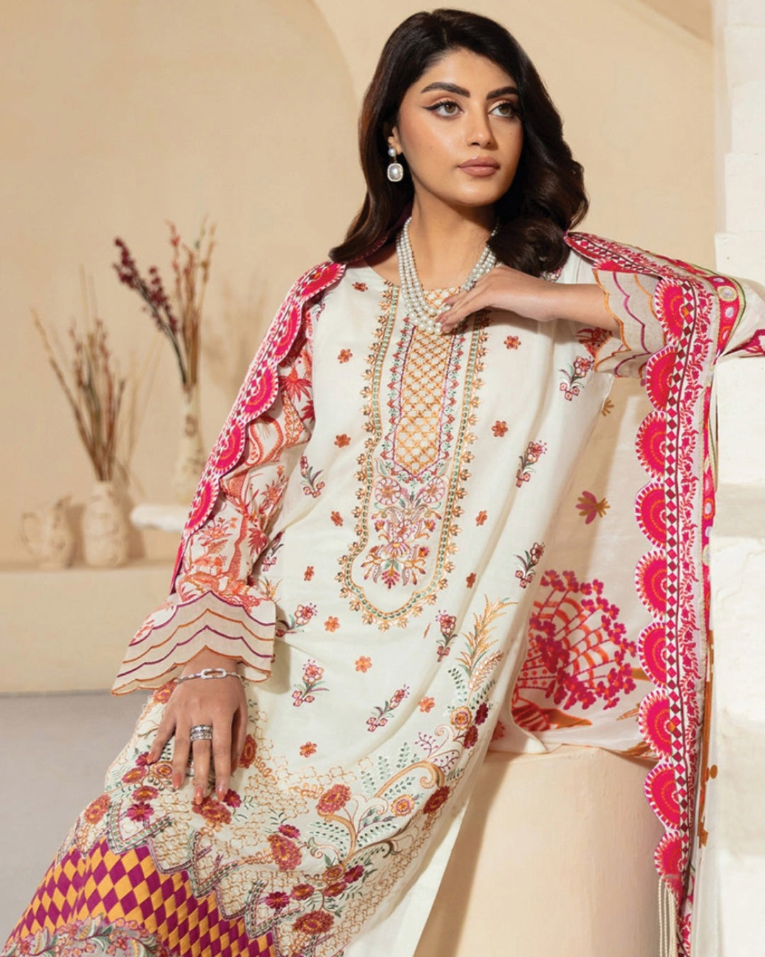 This elegant cream dress features vibrant floral embroidery in shades of red, orange, and pink, creating a lively contrast against its soft base. Made from lightweight fabric, it offers a comfortable, loose fit and flowing sleeves, making it ideal for both casual outings and festive occasions.