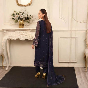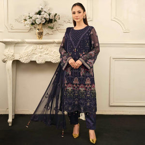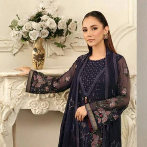 This elegant navy blue dress features intricate floral embroidery in shades of pink, creating a striking contrast. Crafted from lightweight, breathable fabric, it offers a comfortable, loose fit that allows for easy movement, making it ideal for both casual and formal occasions.