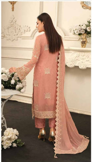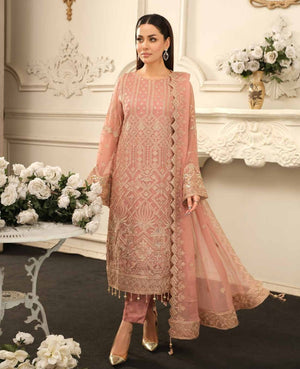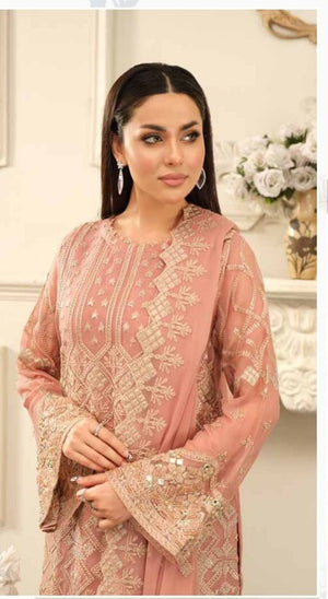 This elegant blush pink dress features intricate gold embroidery, creating a sophisticated and refined look. Crafted from lightweight fabric, it offers a comfortable, loose fit and flowing sleeves, making it perfect for festive and formal occasions.
