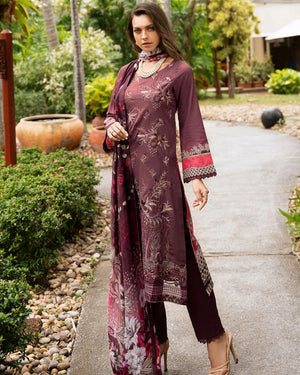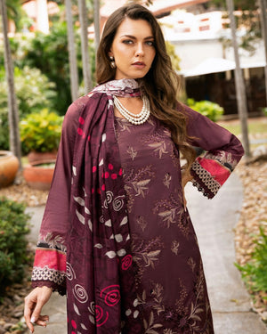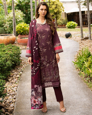 This elegant burgundy dress features intricate floral embroidery and a vibrant dupatta, creating a stylish and rich aesthetic. Made from soft, breathable fabric, it ensures comfort and ease of movement, making it an ideal choice for both casual and festive occasions.