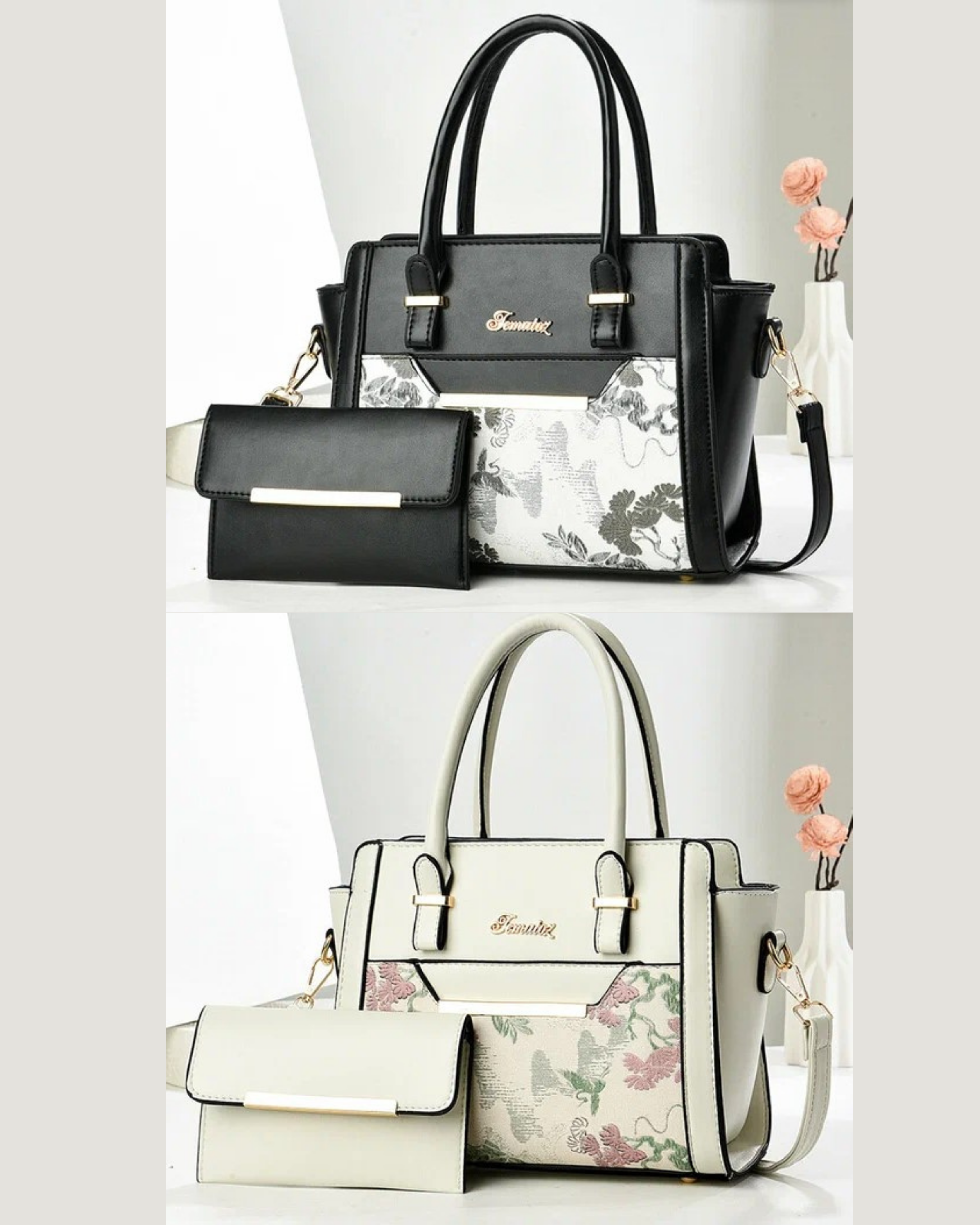 The bag set features two stylish structured totes in black and cream, both adorned with floral accents. Made from durable synthetic material, each tote offers a sophisticated silhouette with top handles. Accompanied by a detachable pouch for added functionality, these bags are versatile enough for both casual and formal occasions, combining practicality with elegant design.